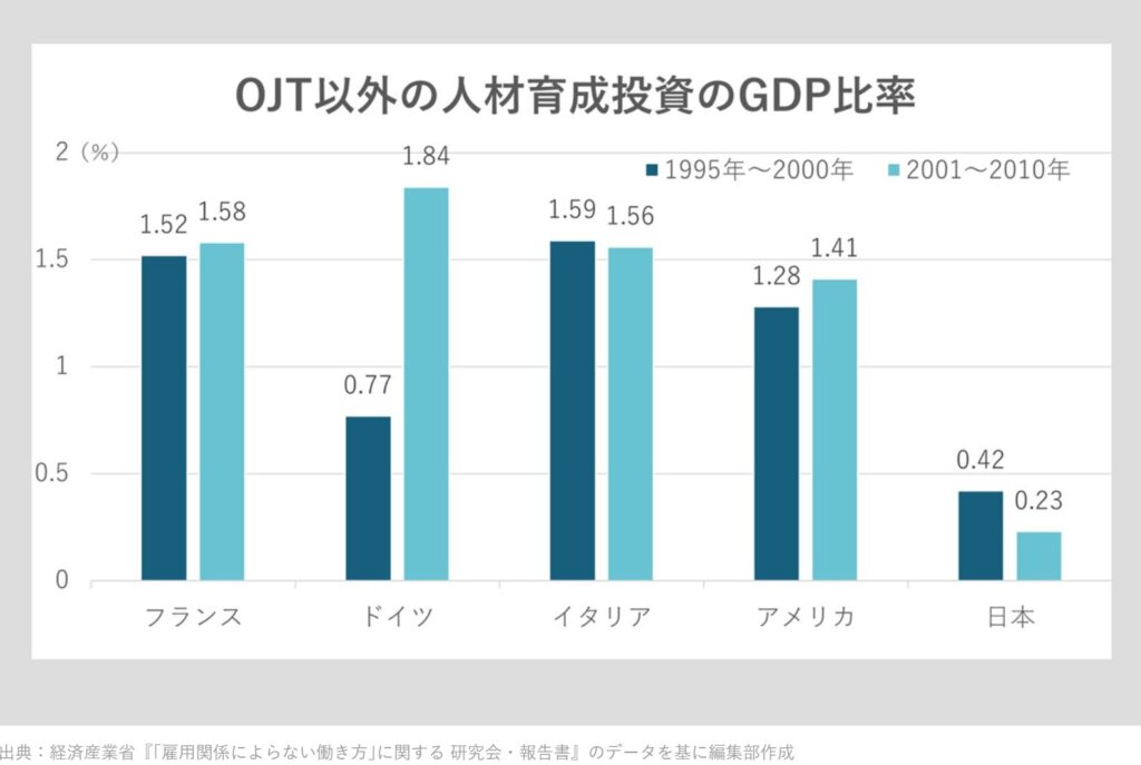 本屋で本を何冊購入していますか?との問いに、「1~2冊」だけと答える比率が圧倒的に高いのは、日本人だけなのです。企業が人材育成にかけるお金も少ないのです。